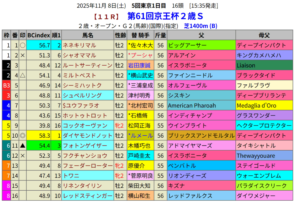 2歳重賞です。昨年のこのレースの勝ち馬パンジャタワーはこの後G1のNHKマイルCを勝利しました。指数1位はダイヤモンドノットです。叔父にダービー馬マカヒキがいる血統です。母父ディープインパクトの2頭が指数上位に来ました。