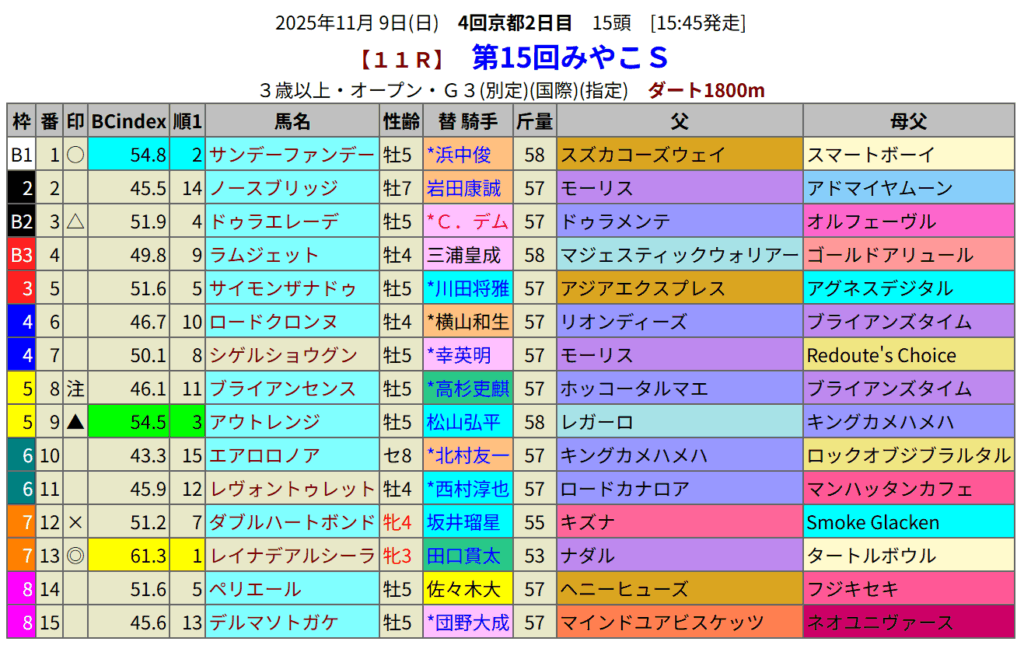 指数1位はレイナデアルシーラです。ポツンと3歳、しかも牝馬です。現在3連勝中で、昇級戦となるわけですが前走トルマリンSも昇級戦を指数1位でBC-Z馬として勝利しています。ちなみにこのレースはBC-index1,2,3位馬で3連単1.9万円馬券でした。ちなみに08ブライアンセンスは叔父に2014年のこのレースを勝ったインカーテーションがいる血統です。みやこS勝ち馬の血が騒ぎます。印を廻しておきます。