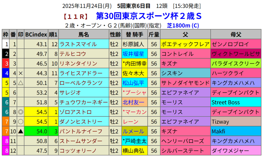 指数1位は2頭でした。2頭は厳密には小数点第5位ぐらいで差がついていたのでとりあえず、ゾロアストロを本命にしました。POGではダノンヒストリーを指名してるので馬券は2頭軸になりそうです。ともに外国人ジョッキーが騎乗するので期待が持てます。