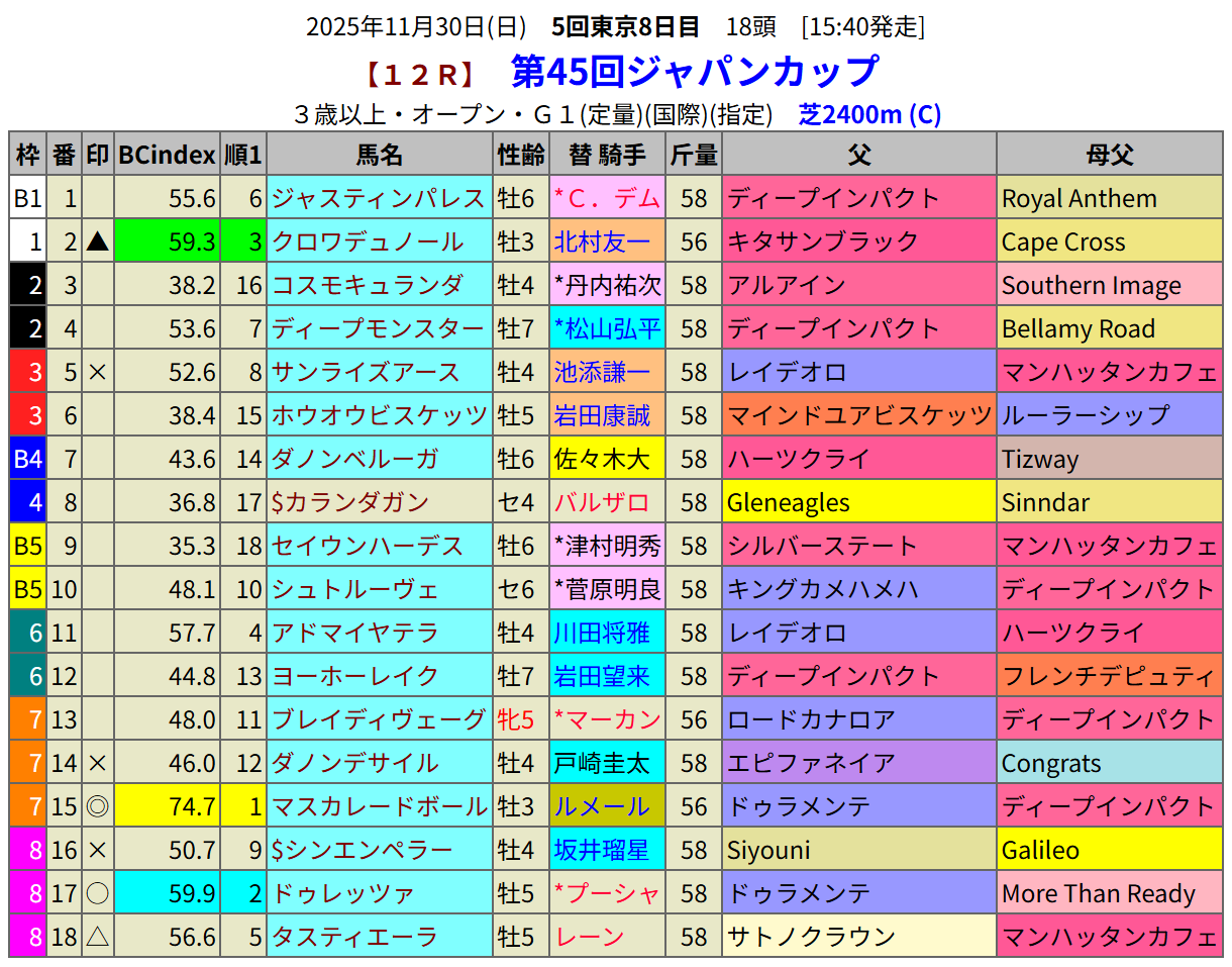 指数1位は天皇賞秋を勝った3歳馬マスカレードボールです。ドゥラメンテ産駒が指数1位2位となりました。ドゥラメント自身はJCには出走しなかった馬です。内枠有利なジャパンCですが、外枠に印が集中してしまいました。内枠で印が付いたヨーロッパ最強馬が参戦ですがクロワデュノールですがこちらも3歳馬で父はキタサンブラックですから親子制覇が懸ります。血騒馬は05サンライズアースです。いとこに2017年のジャパンC勝ち馬シュヴァルグランがいる血統です。現役馬がかなり少なくなったディープインパクト産駒が3頭も出走し、母父ディープインパクトも3頭の出走です。この辺も見ものです。