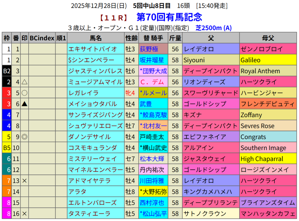 いよいよオーラスです。有馬記念は血統指数の対象のコースではないのが残念ですが、思いきり予想をして馬券を買います。