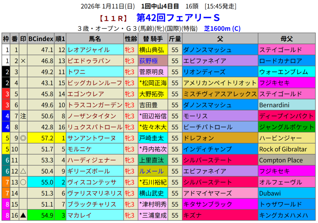 指数1位はサンアントワーヌです。これまで3戦していますが指数1位が2度ありいずれも勝利しています。BC-indexとはとても相性にいい馬です。