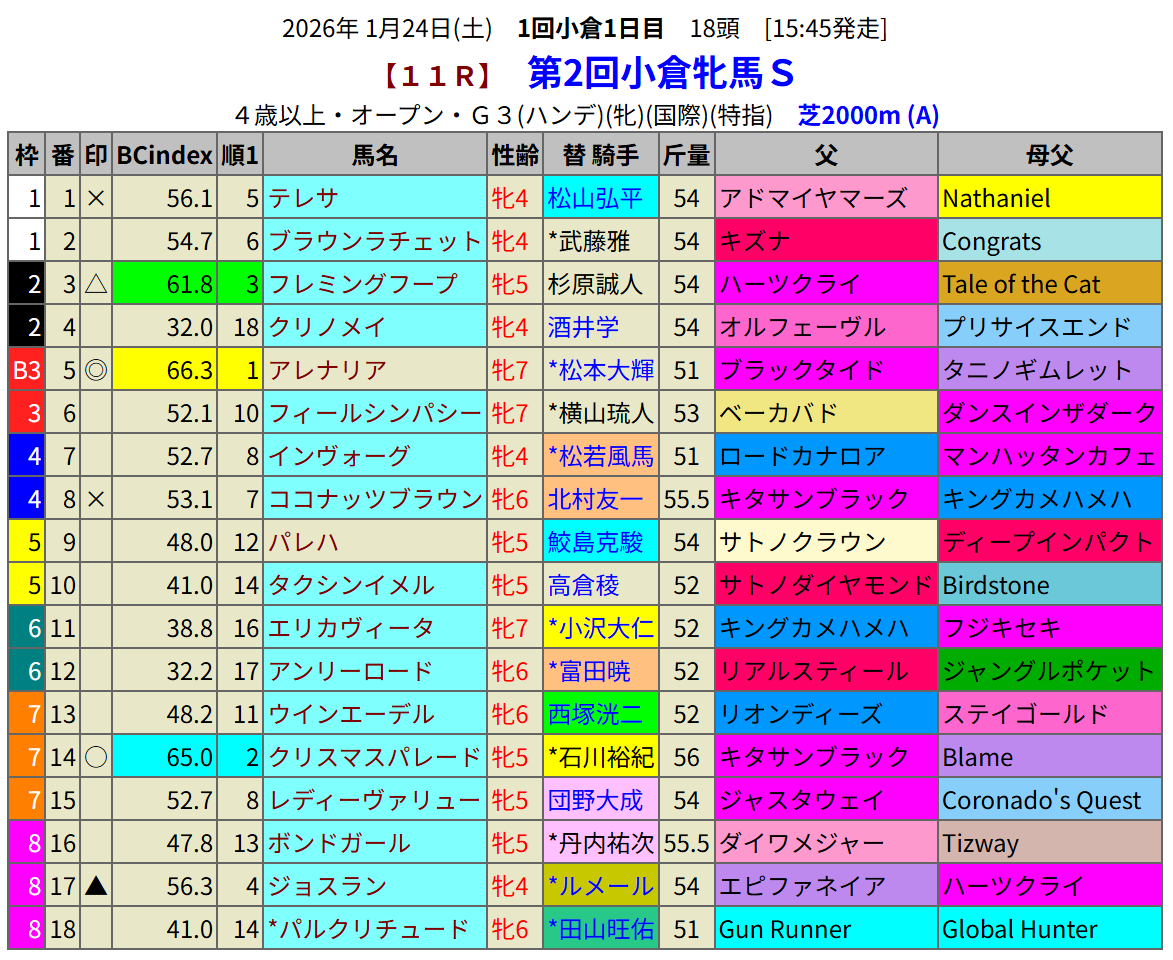 指数1位は7歳馬のアレナリアです。昇級戦になるのでハンデも51kです。軽ハンデで逃げ馬、内枠となれば血統面の適性と合わせて狙ったみたい馬です。サンデーサイレンス(非ディープインパクト)系✕Roberto系はこのコースの適性が良いので指数2位のクリスマスパレードとの2頭軸で行きたいところです。