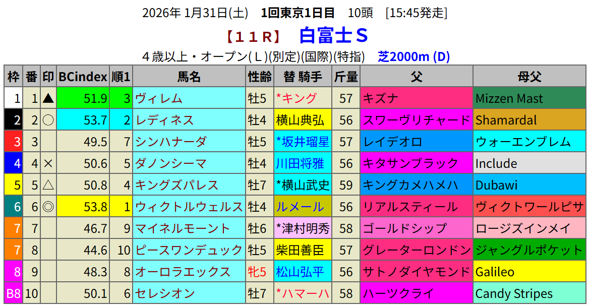 指数1位はウィクトルウェルスです。昇級初戦の場合は指数1位でも軸にする際は検討が必要ですが、このレースは昇級初戦で勝つケースが多く特にそのレースで上がり最速であればなおさらです。指数上位3頭はいずれもその条件を満たしておりこれらも有力です。