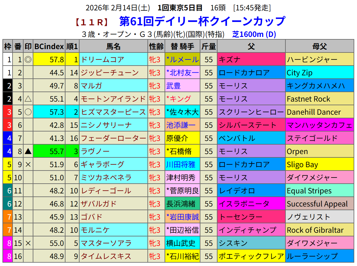 指数1位はドリームコアです。このコースで既に2戦2勝です。何よりも叔母にクロノジェネシスがいる血統です。クロノジェネシスは19年のこのレースの勝ち馬です。ちなみに日曜に行われる京都記念もこの馬は20年に勝っています。この週はこの血が騒いでくれそうです。