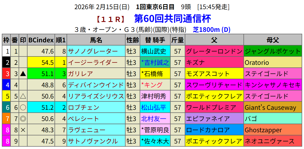 今日は久々に指数1位馬が単勝万馬券になった。さてそんなことは続かないものですから、共同通信杯の指数1位馬は印を外してみました。