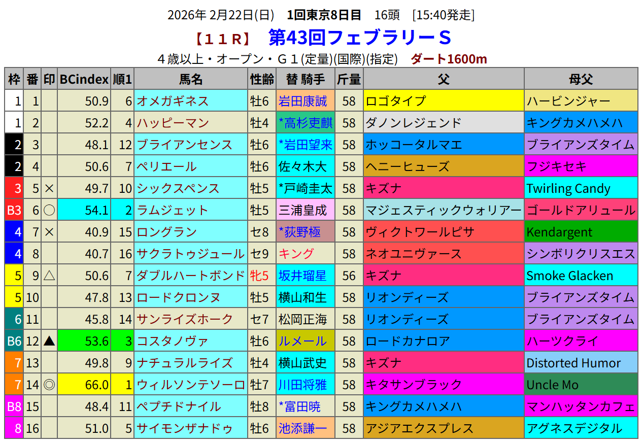 指数1位は14ウィルソンテソーロです。7歳馬がこのレースを勝ったことはなかったので頭では買いにくいので、馬連、3連複あたりの馬券が中心になりそうです。注目は人気は無いのですがロングランです。この日はこの馬を含めて3兄弟が出走します。兄弟たちの走りにも注目です。このレースはゴールドアリュール系が強いのですが唯一その血を引いている指数2位のラムジェットに注目です。