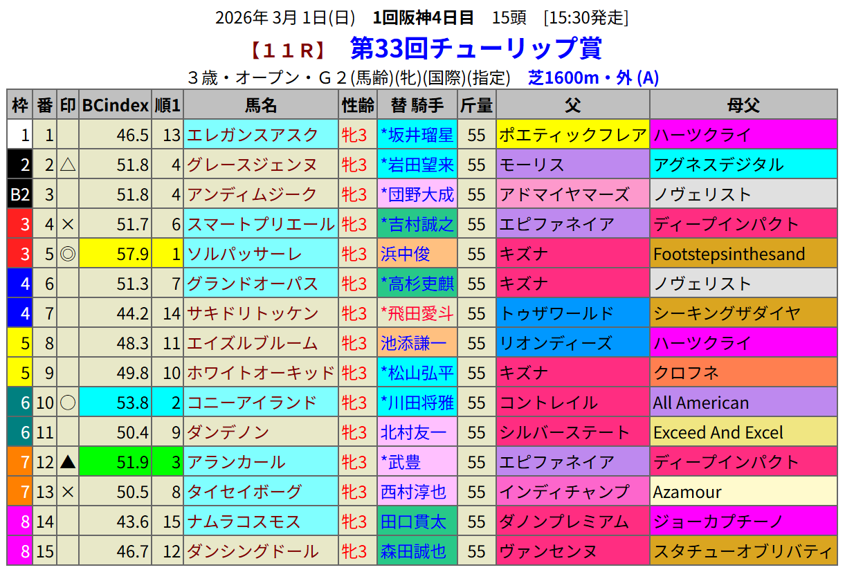 桜花賞を見据えての一戦、3歳牝馬の重賞レースの指数一位はソルパッサーレです。姉に府中牝馬を勝ったセキトバイーストがいる血統です。セキトバイーストはチューリップ賞では2着でした。姉のリベンジを果たしてくれることに期待です。指数2位のコニーアイランドも姉にリバティアイランドがいる血統です。