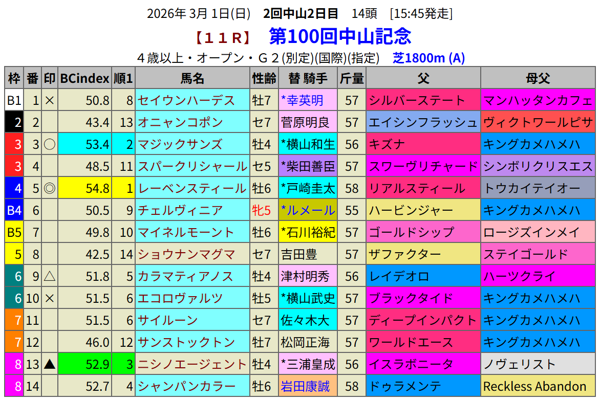 中山記念は過去に連覇した馬が多いのでリピーターに注目したいところですが、残念ながら昨年の勝ち馬は出走していません。その代わりに昨年の2着馬エコロヴァルツが出走です。今日のオーシャンSもそうでしたが2着馬には指数が低くても注目です。指数1位は中山で重賞を2勝しているレーベンスティールです。