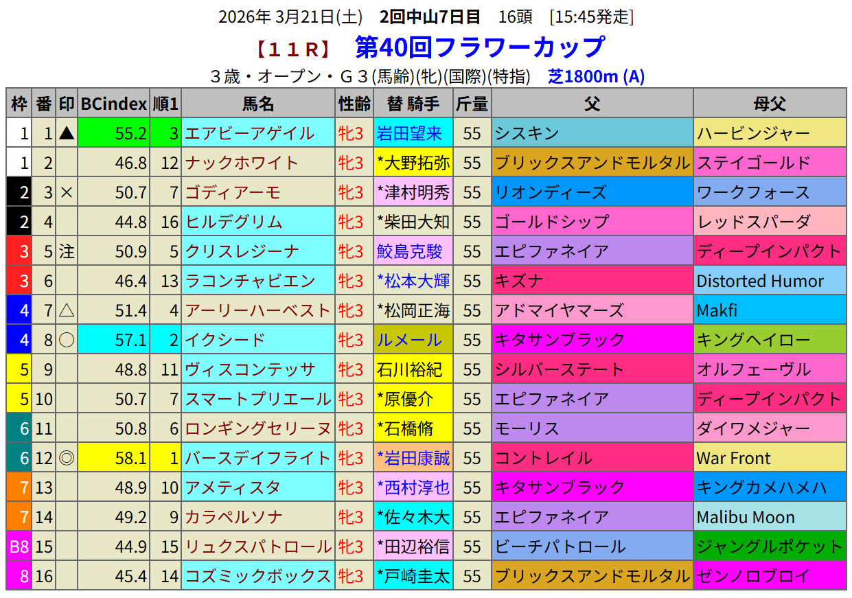 フラワーCの血統指数予想