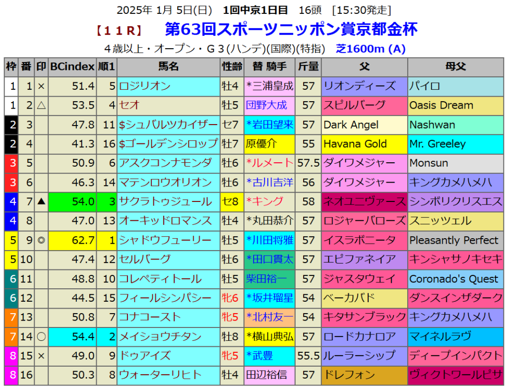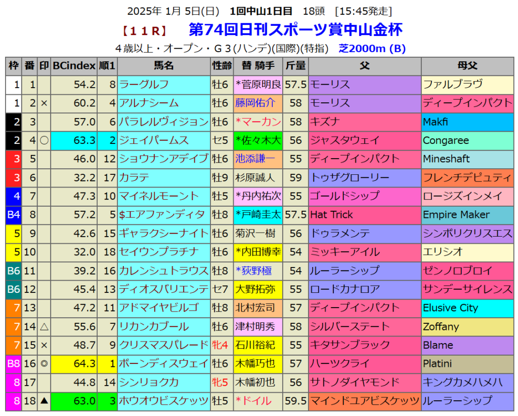 指数1位は6歳馬ボーンディスウェイでした。2歳時にこのコースで2連勝しています。その時もBC-indexは1位でした。先行馬なので外枠が不利な感じもしますが前走のように2,3番手につけれれば先行馬有利のこのコースで好走を期待です。昨年、一昨年の勝ち馬も出走してきますが、昨年の覇者リカンカブールには印を廻しておきます。