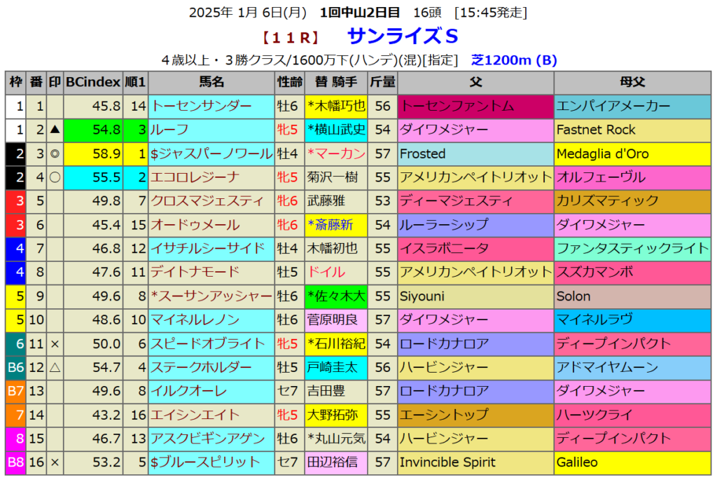 指数1位はFrosteds産駒のジャスパーノワールです。同じFrosteds産駒では同厩舎位にジャスパークローネがいます。芝の短距離では馬券的に信頼度が非常に高い馬です。