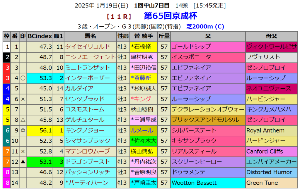 指数1位はキングノジョーです。兄にジャスティンパレスやアイアンバローズがいる良血です。鞍上は今日からスタートのルメール騎手ですがこのレースでは過去6年間で2勝2着1回3着1回と好成績です。