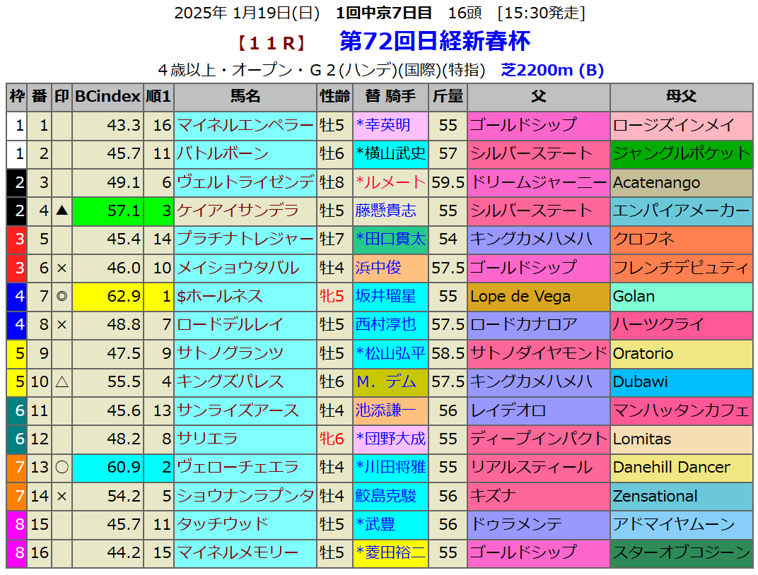 指数1位は牝馬ホールネスです。エリザベス女王杯3着でこのコースでの勝利もあります。これまで7戦してすべて3着以内です。