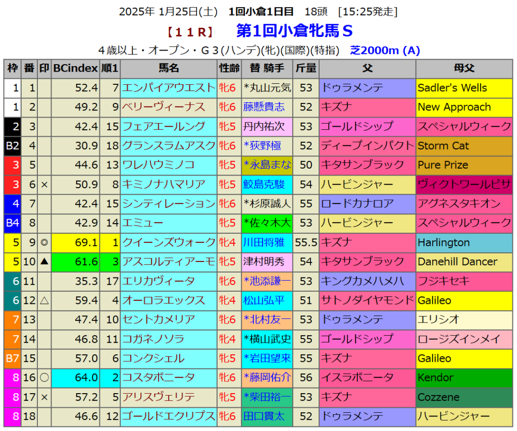 指数1位は4歳馬クイーンズウォークです。唯一重賞2勝馬です。前走の秋華賞では3番人気に推されましたが、15着に惨敗しました。調教ではいい動きのようなので巻き返しに期待です。BC-Z馬でもあります。