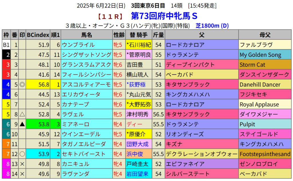 昨年まであった「アイルランドトロフィー」という文言が消えて「府中牝馬S」に戻りました。指数1位はアスコルティアーモです。ハンデは53kですから評価は高く内容で前売り人気でも10番人気あたりです。このコースは3戦2勝と相性が良く、勝てなかったのは昨年のこのレースです。指数1位でしたが、55kで7着に敗れています。妹に先月のヴィクトリアMを勝ったアスコリピチェーノがいる血統です。
