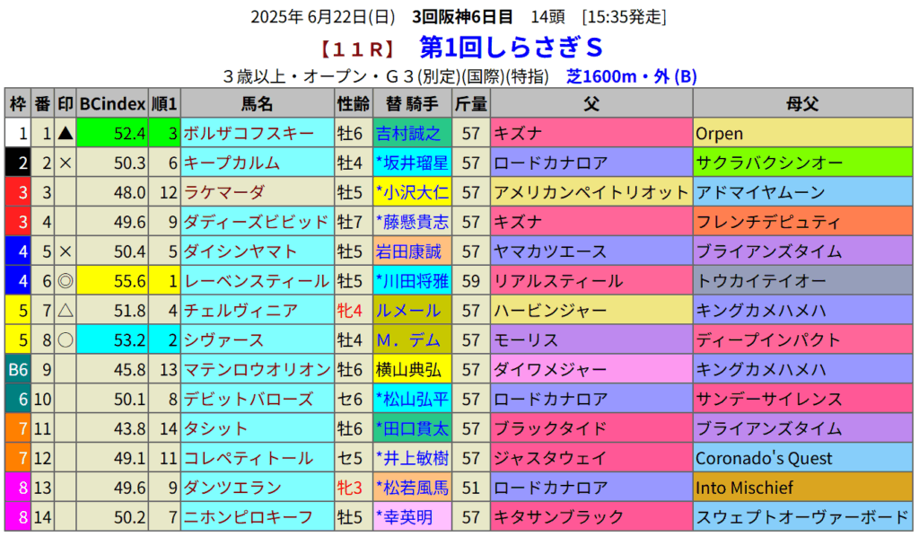 これまでの米子Sが重賞レースとなりG3と格付けされました。指数1位はレーベンスティールです。マイル経験がないだけに血統面だけの適性になっていますが、こういう時は指数2位の馬も軸にしたいと思います。シヴァースのいとこのディヴィーナは一昨年のこのレースの勝ち馬です。血が騒ぎます。