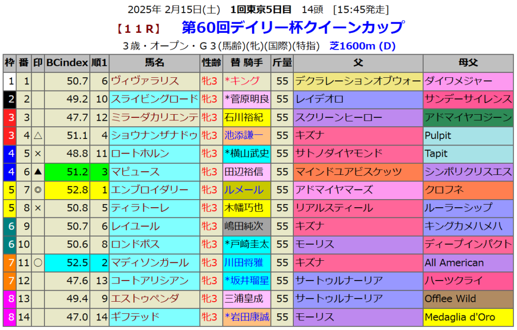 指数1位はアドマイヤアーズ産駒のエンブロイダリーです。これまで4戦してすべて1番人気でした。しかも圧倒的な1番人気。ビワハイジのひ孫にあたる血統ですから近親にはブエナビスタがいる血統です。印が廻りませんでしたが、02スライビングロードは2004年のこのレースの勝ち馬ダイワエルシエーロの仔ですから母娘制覇が懸る一戦になります。血騒馬です。