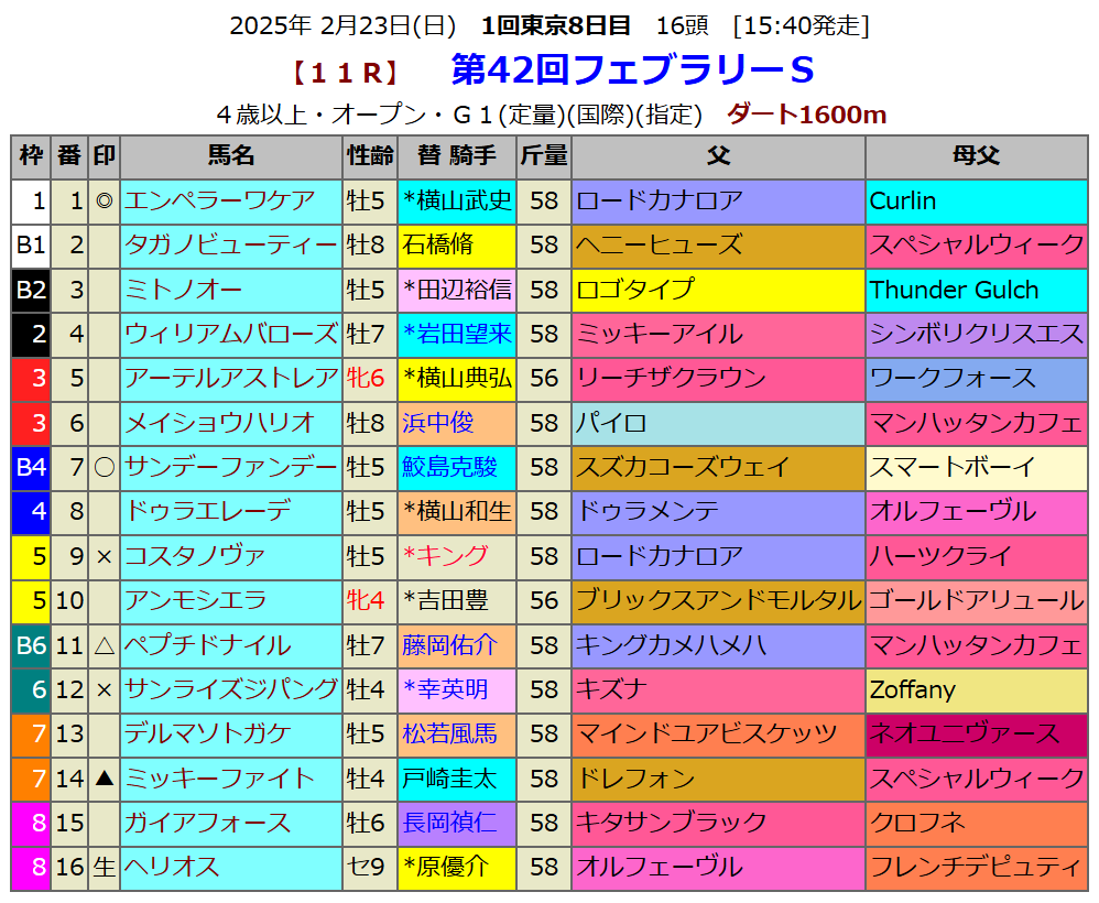 フェブラリーSの血統指数予想