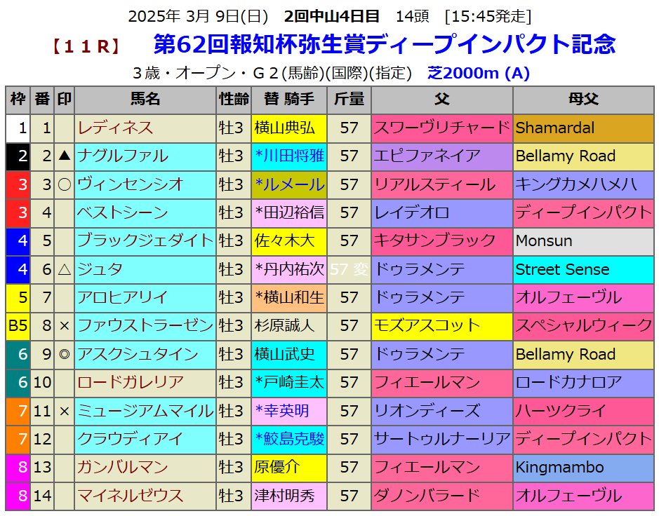 関東地方の雪予想の影響で前売りが行われていません。人気が判らないのですが指数1位馬は人気のない馬という事は容易に想像ができます。ディープインパクト記念と冠がついて6年目でしょうか今年もディープインパクトの血を引く馬が6頭出走します。