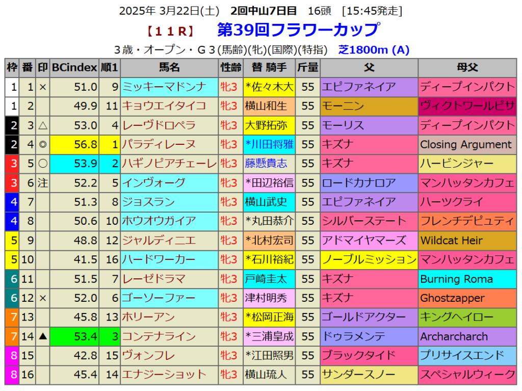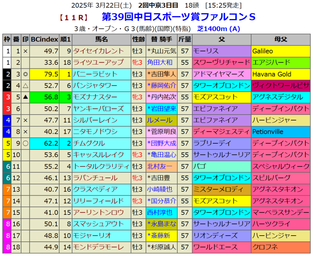 指数1位はバニーラビットです。アドマイヤマーズ産駒は芝1400mはよく走ります。指数2位のチムグクルはこの日誕生日です。人気のない馬ですが2頭には注目です