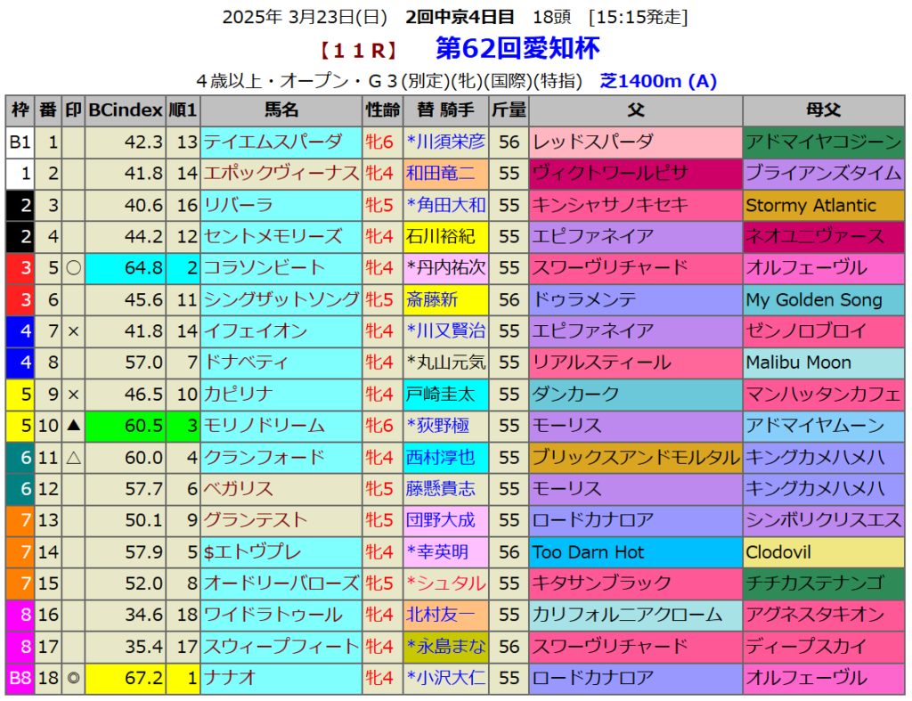 今年から140mとなった愛知杯です。指数1位は大外のナナオです。人気がない馬ですが、母父オルフェーブルがここでは上位になりました。