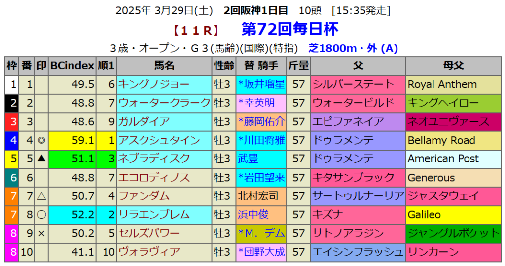 毎日杯の血統指数予想