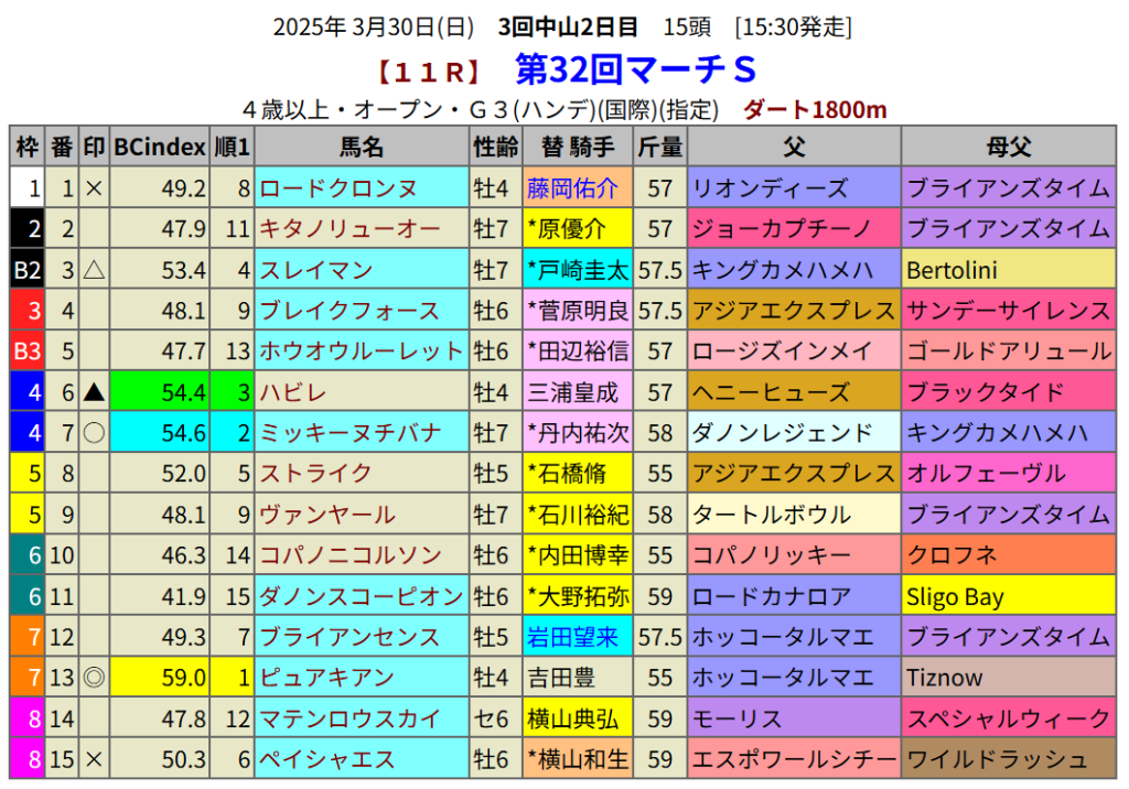 指数1位はビッグシーザーです。父ビッグアーサーは2016年のこのレースの勝ち馬ですから親子制覇が懸る血騒馬です。ビッグアーサー産駒が指数上位になり印が廻ります。また昨年の覇者ナムラクレアはこの日が誕生日です。