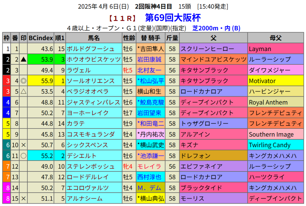 指数1位はソールオリエンスです。一昨年の皐月賞馬ですがその後勝利がありませんが、大敗と言えるのは昨年のJCだけです。前走の京都記念は上がり最速ですからこの距離では期待が持てそうです。父はキタサンブラックですからこのレースでは親子制覇が懸ります。