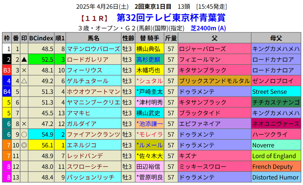 指数1位はそのノーザンF生産馬のエネルジコです。BC-Z馬でもあるので軸の信頼度は高いです。ここまで2戦2勝です。しかも東京競馬場での2勝です。他に気になるのはフィーリウスです。近親に青葉賞を2015年に勝ったレーヴミストラルや09年に勝ったアプレザンレーヴがいる血統です。またゲルチュタールの母父ゼンノロブロイやガルダイアの父父はシンボリクリスエスも青葉賞勝ち馬なので印を廻してみました。