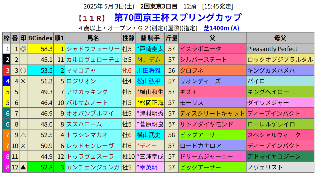 指数1位はシャドウフューリーです。G1馬ママコチャを抑えて指数1位です。ちなみにママコチャは東京が初コースです。近親にこのレースを勝っているメイケイエールがいるという血統ではありますが、ここはこのコースに実績のあるシャドウフューリーの方を軸にしたいと思います。