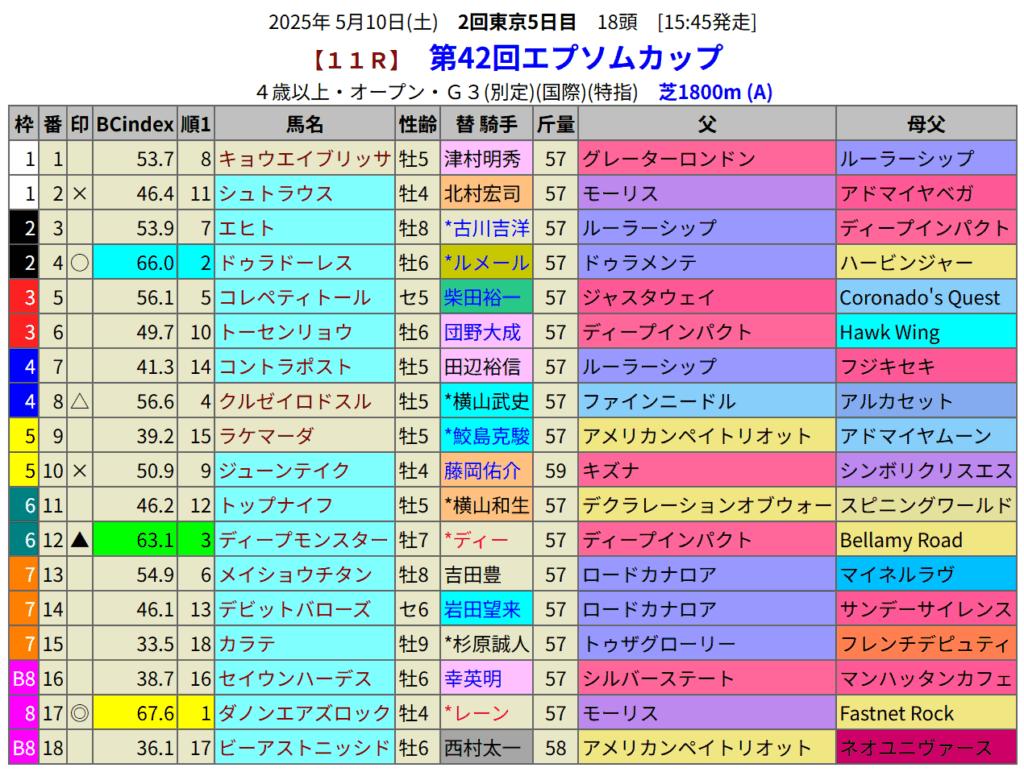 NHKマイルCウィークです。東京競馬場で5週連続でG1が開催されます。休む暇もなくこの間は飲み会も自粛する予定です。血統指数予想はエプソムC、京都新聞杯はBC-index対象外コースなので指数はありません。
