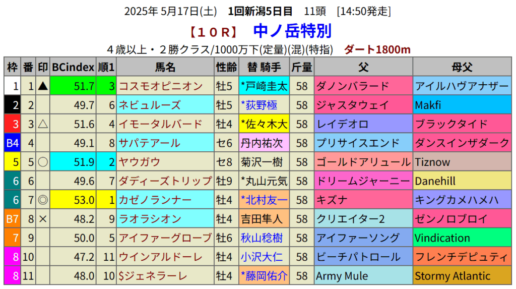 週末の天気が悪いのですが、この先の天気予報を見てもなぜか土日だけ、天気が良くないようです。とても気になります。土曜日の重賞は新潟大賞典がありますが新潟の芝2000mは外回りと内回りを使い分けているため施行数が少なくデータが足りないためにBC-indexの対象外コースとなっています。そのためその前の中ノ岳特別の予想です。