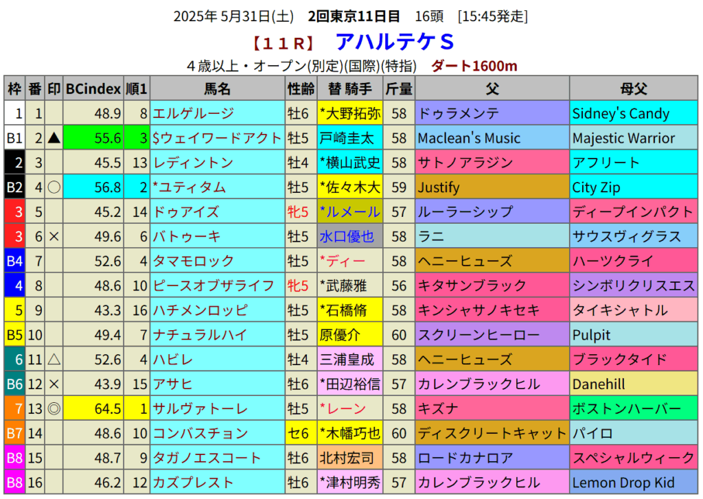 指数1位はダービー馬キズナの産駒サルヴァトーレです。このコースは経験が豊富で(2.4.1.2)という成績です。2回3着外になっていますがこの時だけこの馬は指数1位でした。3度目の正直となりますが鞍上がD.レーン騎手なら十分期待できます。