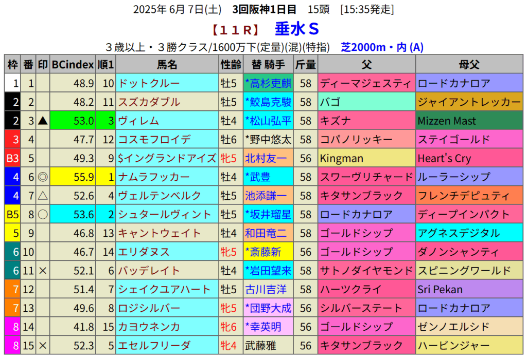 指数1位はナムラフッカーです。先週重賞勝ちをした武騎手に手綱が戻りました。