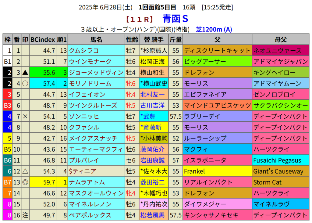函館の芝1200mのオープン特別です。指数1位は昇級初戦となるナムラアトムです。こういう場合は指数2位馬を軸にして馬得kんを購入するケースもありますがここはハンデ戦です。血統的にも姉にナムラクレアがいる血統です。ナムラクレアは重賞5勝の実力馬で函館スプリントSも勝っています。好走期待です。