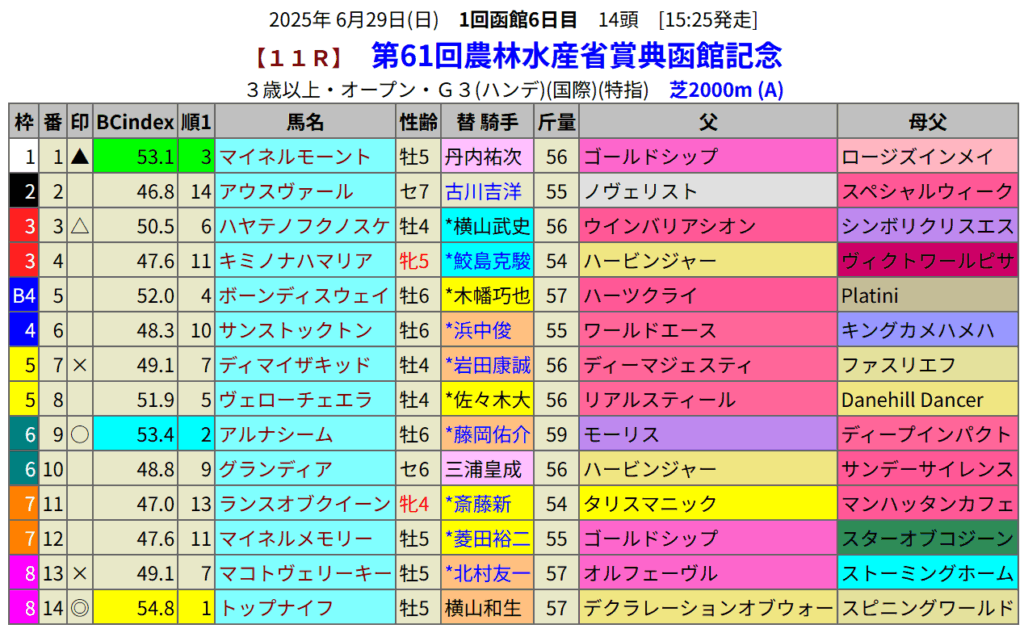函館記念の血統指数予想