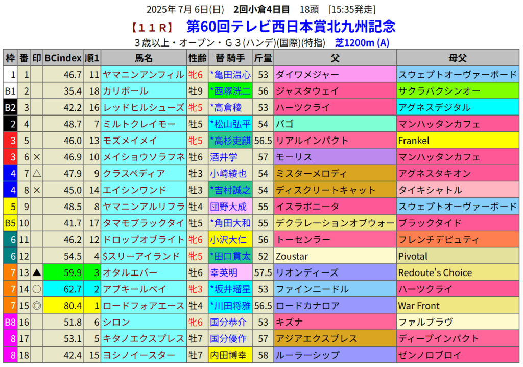 指数1位はロードフォアエースです。芝1200mでは7戦して2勝ですが連対外してはいません。2月の北九州短距離Sでは1番人気2着と好走しています。このコースでは圧倒的に信頼度が高いロードカナロア産駒で、ここには1頭だけの出走という事もあって十分狙いどころです。