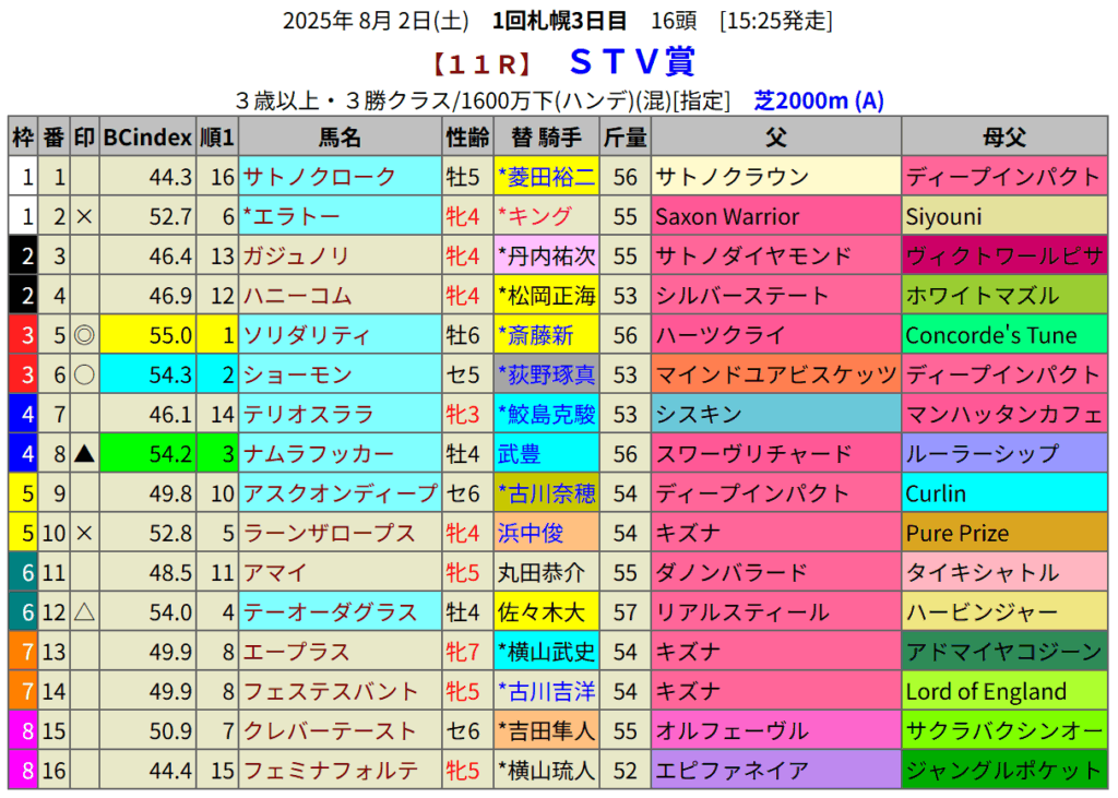 指数1位は6歳馬ソリダリティです。前走は格上挑戦して好走しました。クラスが戻ってここはチャンスです。佐々木騎手がこの馬を選ばなかったのは少し気になりますが、軸馬としては人気をみえも狙いどころです。