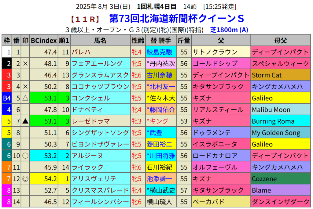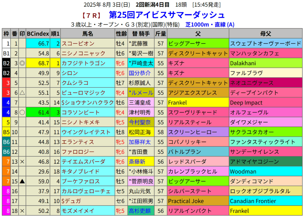 指数1位はカフジテトラゴンですが、昇級戦で尚且つ内枠ですので軸にはしにくいところです。指数2位のスコーピオンは同じ理由で無印としました。軸は15ブーケファロスあたりから流してみたいと思います。ちなみにクムシラコは22年のこのレースの勝ち馬ビリーバーの半弟です。兄弟制覇が懸ります。