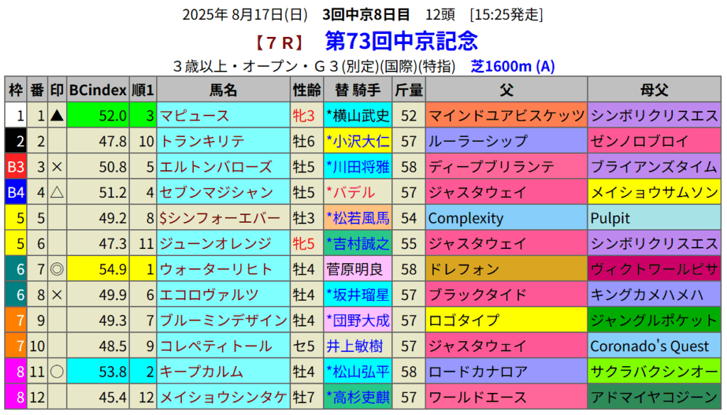 指数1位はウォーターリヒトです。ドレフォン産駒で芝のマイル戦で指数1位になるのは珍しいですが、この馬自身もこれまで14戦してますが初めての指数1位です。ちなみに半妹のウォーターガーベラ(3歳)はマイル重賞の2戦してますが2着3着と好走してます、