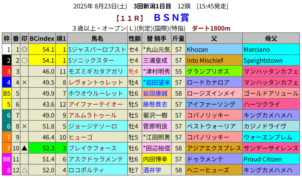 指数1位は1枠1番のジャスパーロブストです。逃げ馬ですから絶好枠です。このコースでは2勝の実績があります。ちなみにこの馬はBC-Z馬です。同じ指数1位のソニックスターは前走では3連複万馬券の軸馬となってくれました。指数3位のブレイクフォースは昨年のこのレースの勝ち馬です。