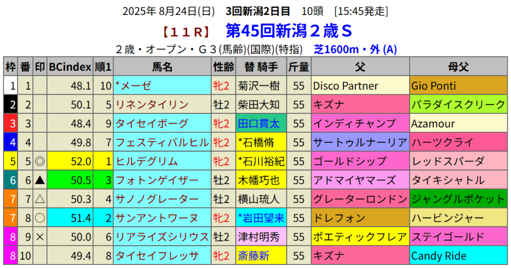 指数1位はヒルデグリムです。ゴールドシップ産駒です。ゴールドシップ✕Helo系は芝での勝ち数が産駒では1番多く2021年のオークス馬ユーバーレーベンなども同じ配合です。