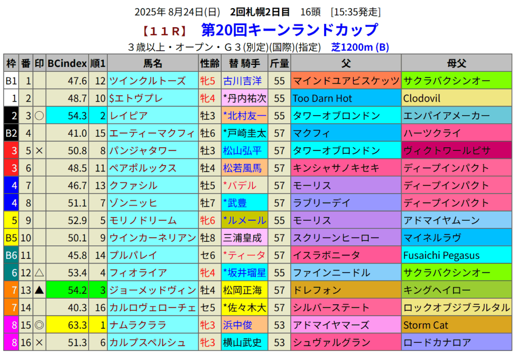 指数上位2頭は血騒馬となりました。指数1位のナムラクララは姉のナムラクレらが23年にこのレースを制しています、姉妹制覇が懸ります。また指数2位のレイピアの母母クーヴェルチュールは2007年のこのレースの勝ち馬です。キーンランドCの過去の勝ち馬の血が騒ぎます。ともに3歳馬です。