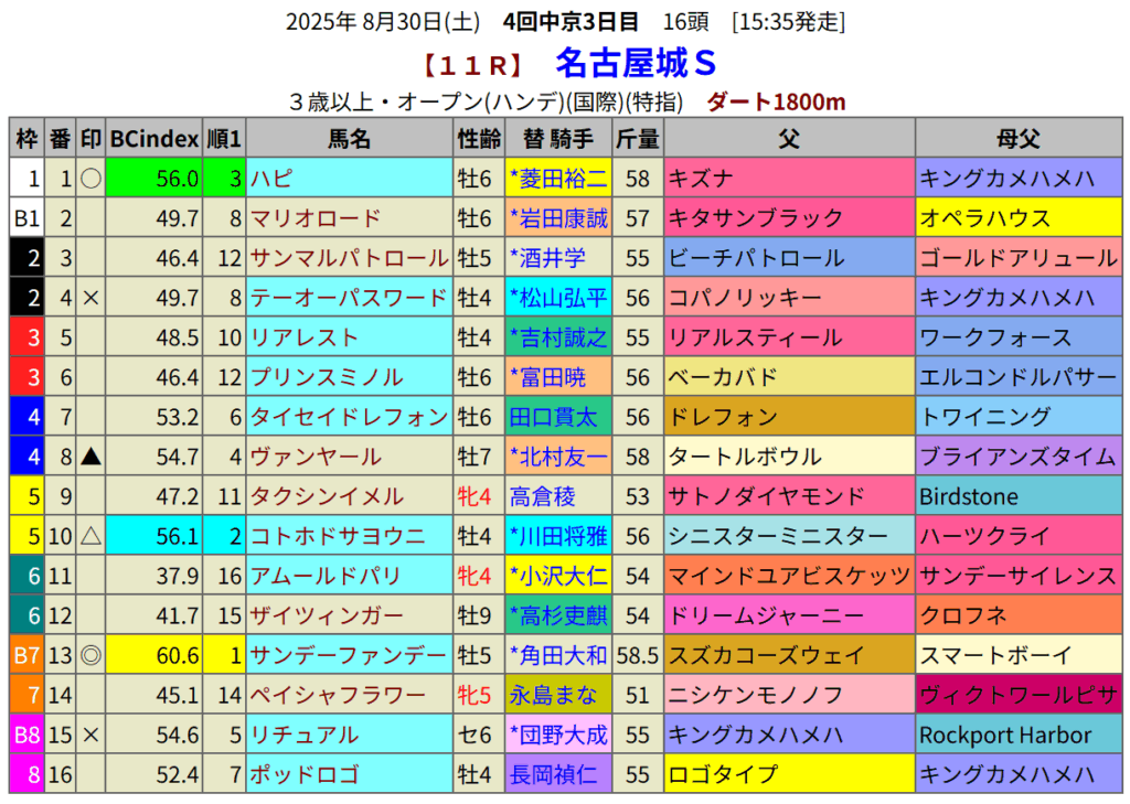 名古屋城Sの血統指数予想