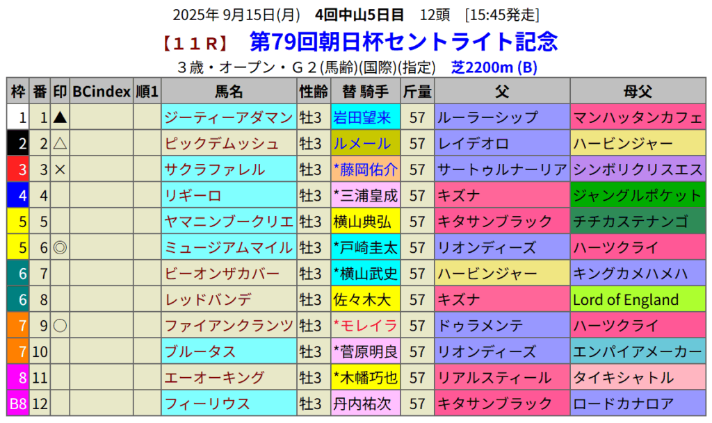 菊花賞に繋がるセントライト記念が行われる中山の芝2200は残念ながらBC-indexの対象外コースです。それでも血統適性を意識した予想です。