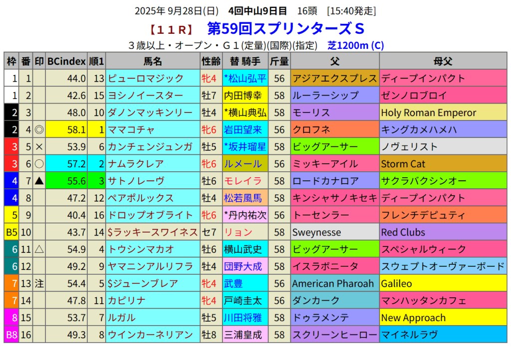 秋のG1第1弾、スプリンターズSです。今日のシリウスSはBC-index指数馬ではなく血騒馬が勝利しました。スプリンターズSでも血騒馬には注目です。