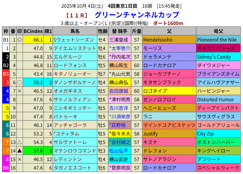指数1位は1枠1番ウェットシーズンです。G1を勝った三浦騎手の勢いも期待できます。このクラス、昇級初戦にはなりますがこのコースでが前走でも勝利してますが(4.1.0.0)というとても相性がいいコースです。オープンの壁もあっさり突き破ってくれそうです。