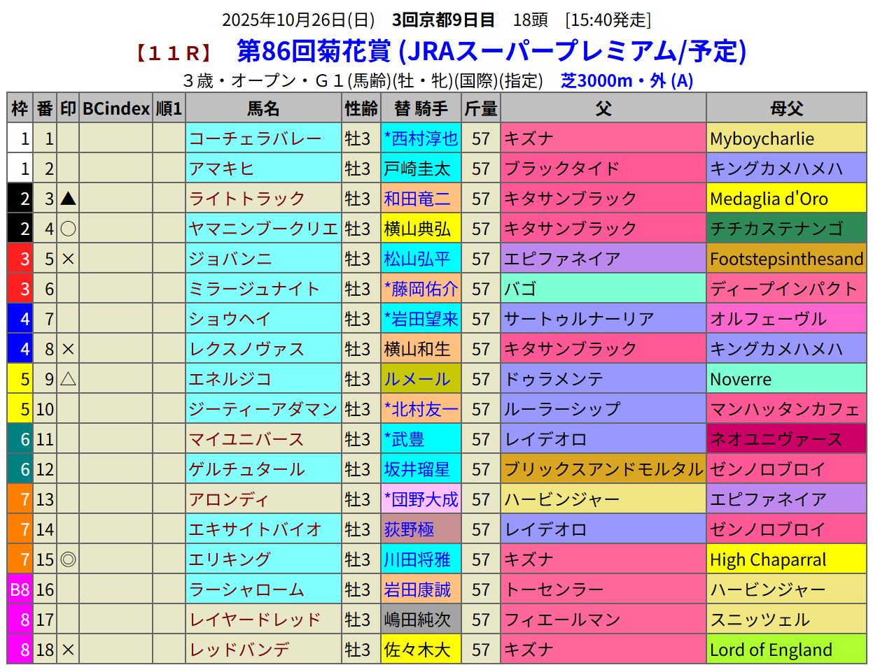 今年の菊花賞にはG1馬のの出走がありません。芝3000mのレースですからBC-indexもありませんが、血統を基に予想します。