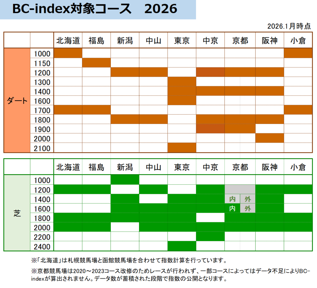BC-indexの対象となるコースは下記のとおりです。BC_indexは過去のレース数に基づいてデータを検証しているため、レース数の少ないコース(障害コースなども)は対象外となっています。(※京都競馬場のコースは2021年~の改修工事にて開催期間が無かったために、データが不足しており指数算出ができていません)